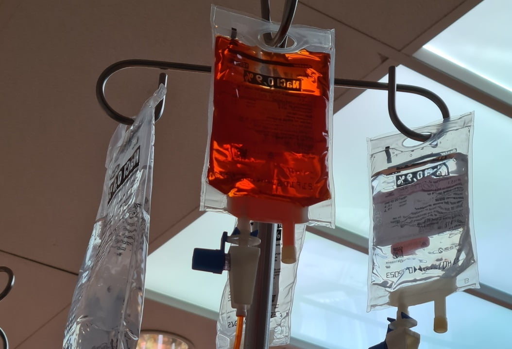 Mijn infuuspaal piept. ‘O, je voorafje zit er al in!’ zegt Schaar Verpleegkundige. ‘We gaan even spoelen en dan kan straks je eerste zak erin.’